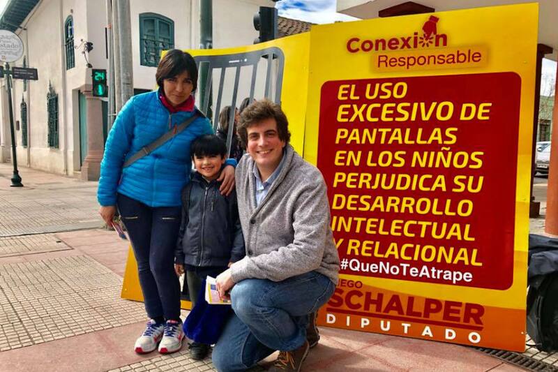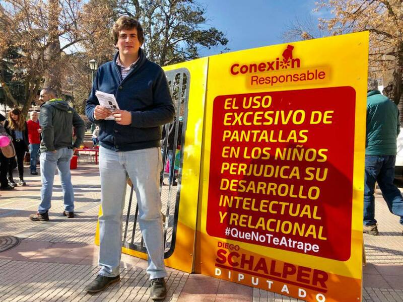 El Diputado RN Diego Schalper está realizando intervenciones urbanas para entregar información y mostrar los peligros del uso excesivo del celular en niños menores, bajo el lema "Que No Te Atrape."