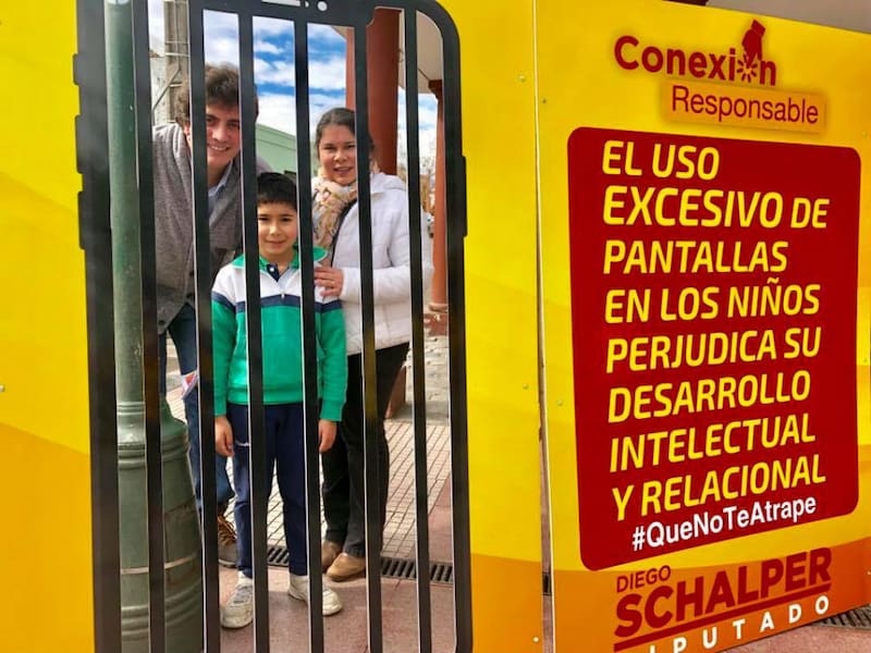En relación a la Consulta Nacional sobre uso de celulares en los colegios que está impulsando el Ministerio de Educación, el diputado RN y miembro de la comisión de Educación, Diego Schalper, ha realizado varias intervenciones urbanas con un celular gigante que simula una cárcel, en la cual invita a los padres junto a sus hijos a fotografiarse.