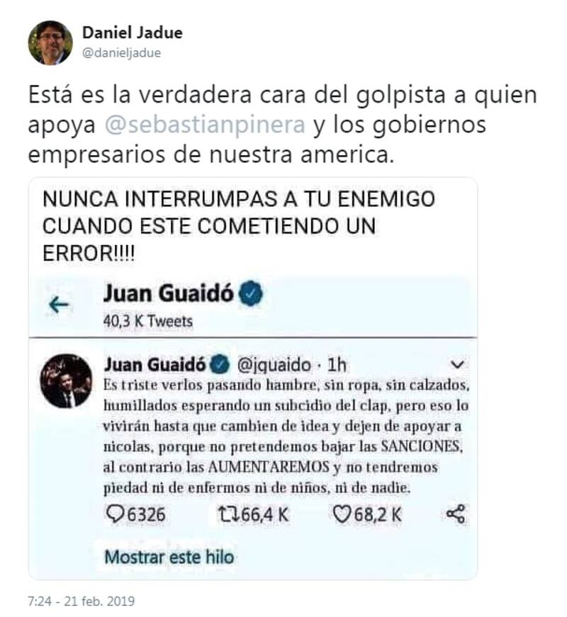 "Es triste verlos pasando hambre, sin ropa, sin calzados, humillados esperando un subcidio del clap, pero eso lo vivirán hasta que cambien la idea y dejen de apoyar a nicolas, porque no pretendemos bajar las SANCIONES, al contrario las AUMENTAREMOS y no tendremos piedad ni de enfermos ni de niños, ni de nadie", dice el texto que se le atribuye a Guaidó.