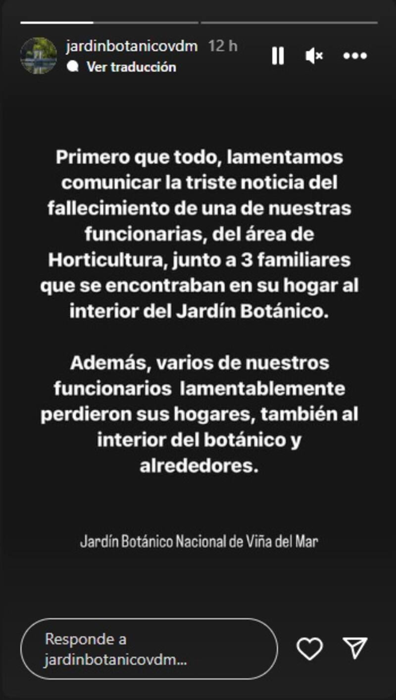 “Primero que todo, lamentamos comunicar la triste noticia del fallecimiento de una de nuestras funcionarias, del área de Horticultura, junto a 3 familiares que se encontraban en su hogar al interior del Jardín Botánico”, señalaron desde el parque.