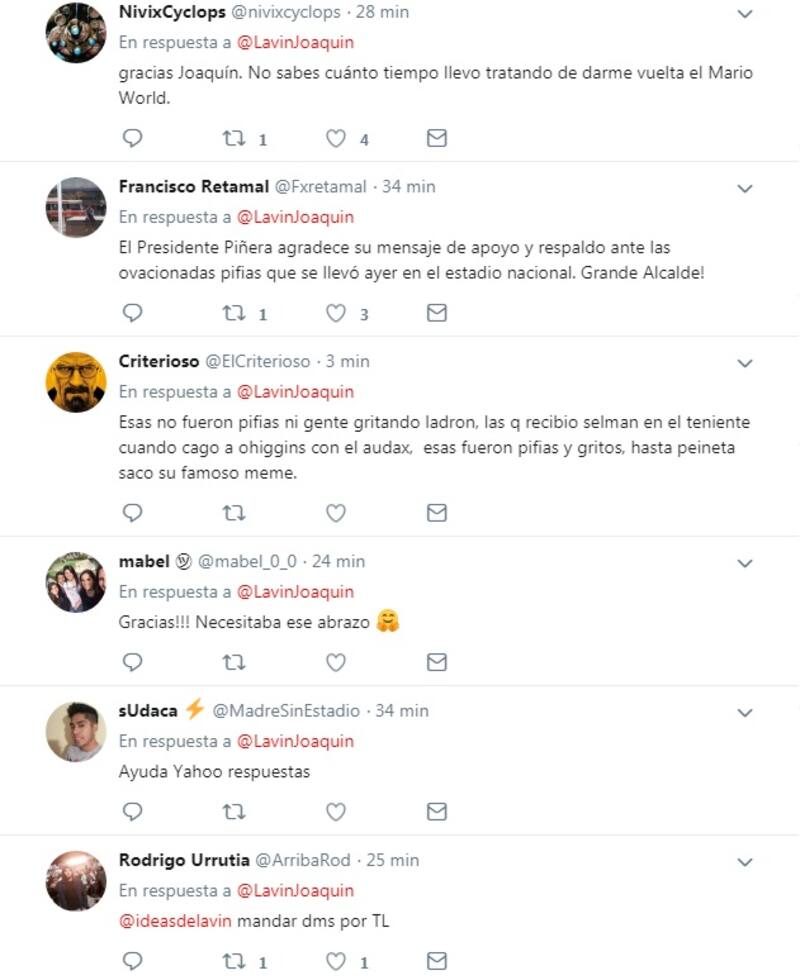 "Gracias tocayo", "yo de verdad la quería, la amaba; era todo para mí. Pero él tiene 20 años menos, más energía y gran futuro. Abrazo", "Don Joaco!!! se le arrancó un DM pero voy a aprovechar el abrazo", "Don Joaquín, parece que se le están escapando los DM" y "¿Don Joaquín por qué habla solo?", fue algunos de los comentarios que recibió su misterio tuit.