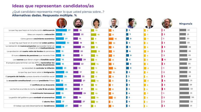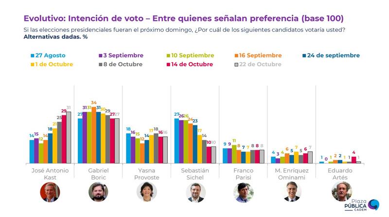 El candidato de Apruebo Dignidad sigue en segundo lugar sumando un 20% de las preferencias, seguido por Yasna Provoste con un 12%, Sebastián Sichel con un 7%, Franco Parisi con un 6%, Marco Enríquez-Ominami con un 5% y Eduardo Artés con una baja a 1% de las preferencias.