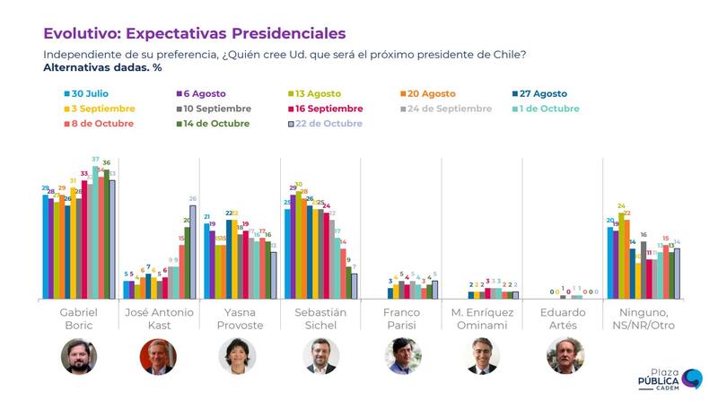 Si bien, José Antonio Kast lidera parte de los posibles votos, respecto a la pregunta "Independiente de su preferencia, ¿Quién cree Ud. que será el próximo presidente de Chile?", el candidato Gabriel Boric se queda en primer puesto con un 33%.
