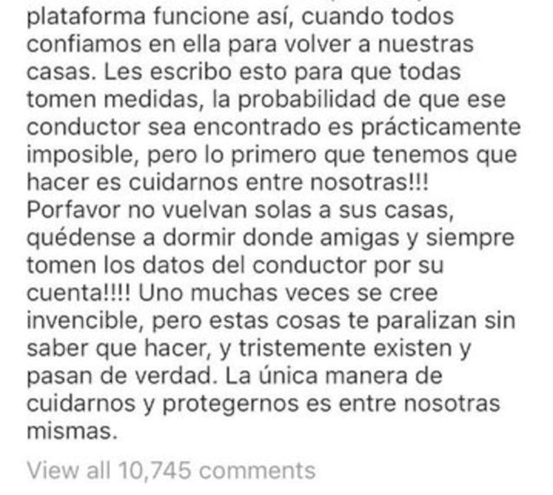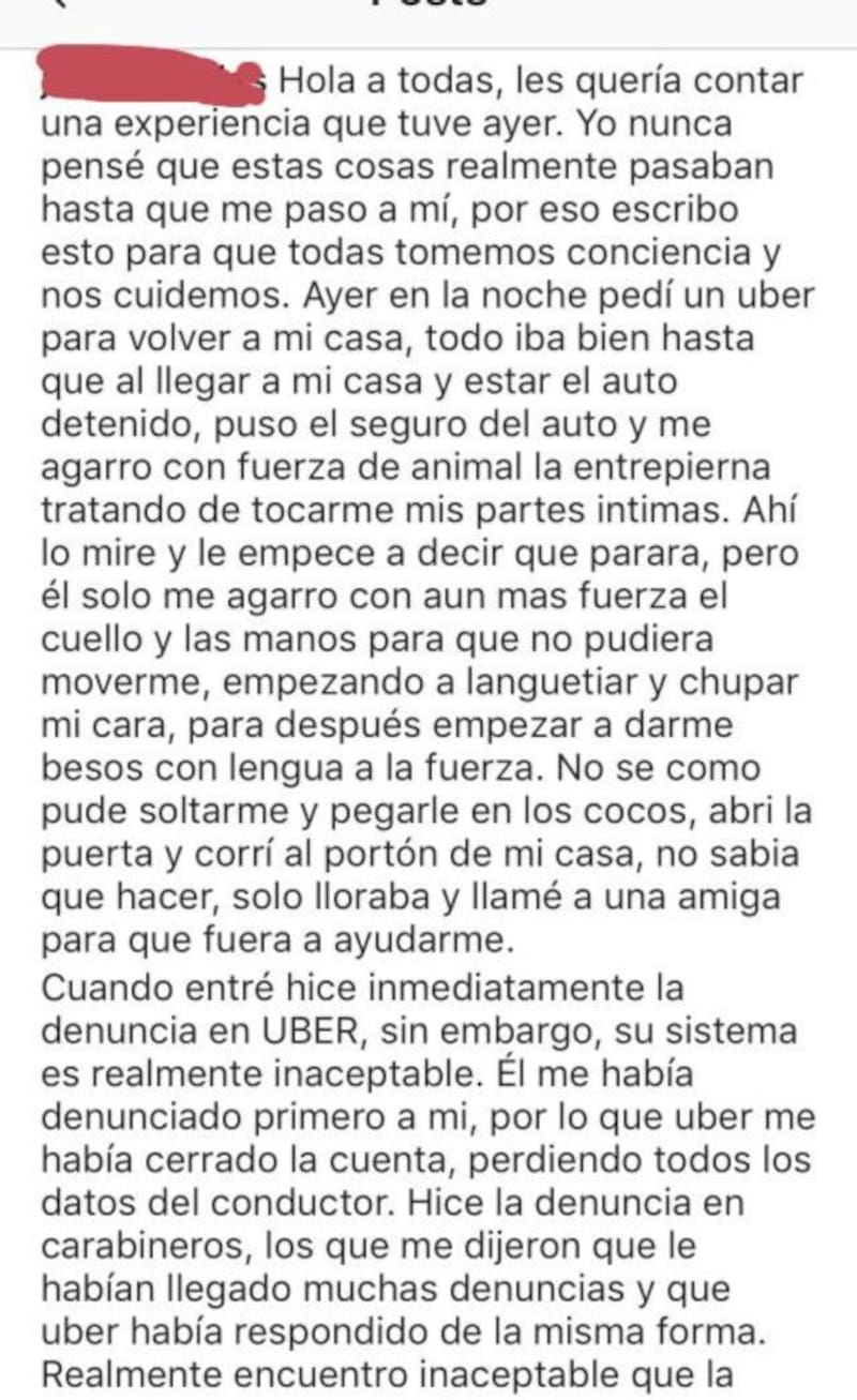 "Ayer en la noche pedí un Uber para volver a mi casa, todo iba bien hasta llegar a mi casa y al estar el auto detenido, puso el seguro del auto y me agarró con fuerza la entrepierna tratando de tocar mis partes íntimas", señala en la publicación.