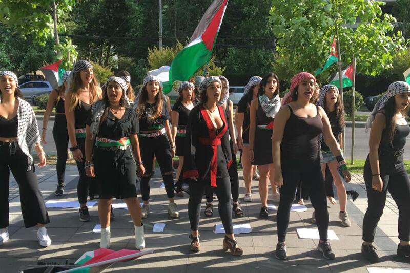 Alrededor de 30 jóvenes chilenas de origen palestino quisieron visibilizar los atropellos a sus derechos, por lo que se sumaron a la intervención feminista del colectivo Las Tesis, interpretando en árabe "Un violador en tu camino" frente a la Embajada de Israel en nuestro país.