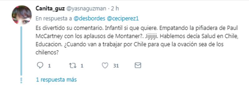 Lo que más se preguntaban los cibernautas era si la publicación de Desbordes era una forma de "empatar" la pifiadera que ocurrió durante el recital de Paul McCartney, cuando el ex Beatle saludó al Presidente Piñera durante su presentación el pasado de marzo.