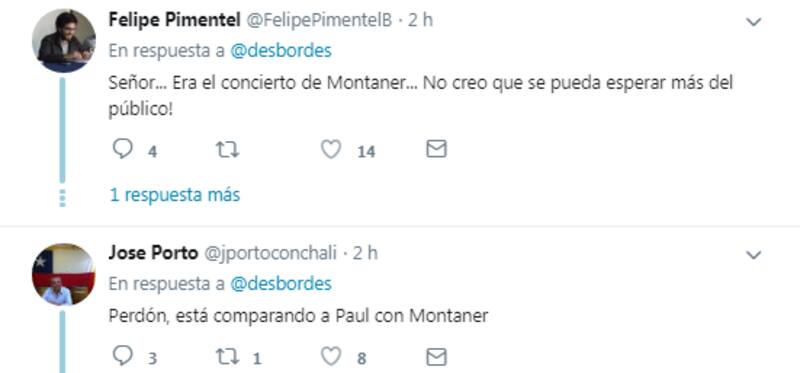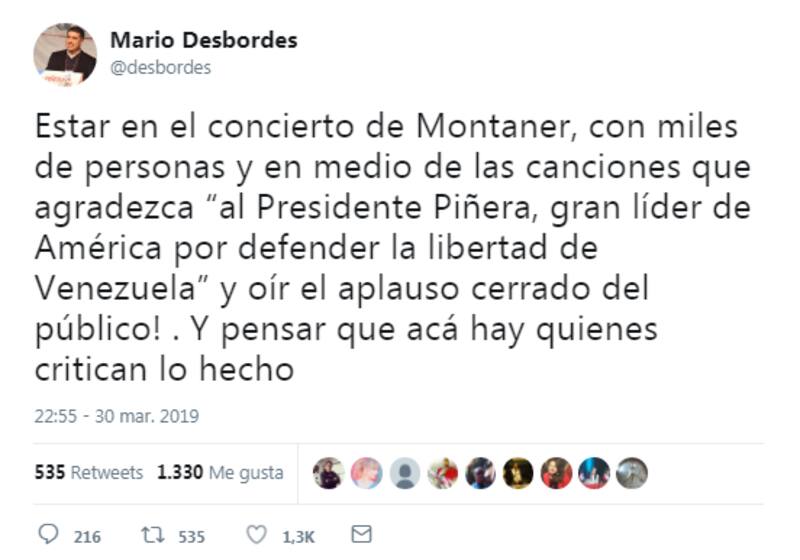 "Estar en el concierto de Montaner, con miles de personas y en medio de las canciones que agradezca "al Presidente Piñera, gran líder de América por defender la libertad de Venezuela" y oír el aplauso cerrado del público! . Y pensar que acá hay quienes critican lo hecho", celebró Desbordes, sin imaginar que provocaría una hilarante discusión.