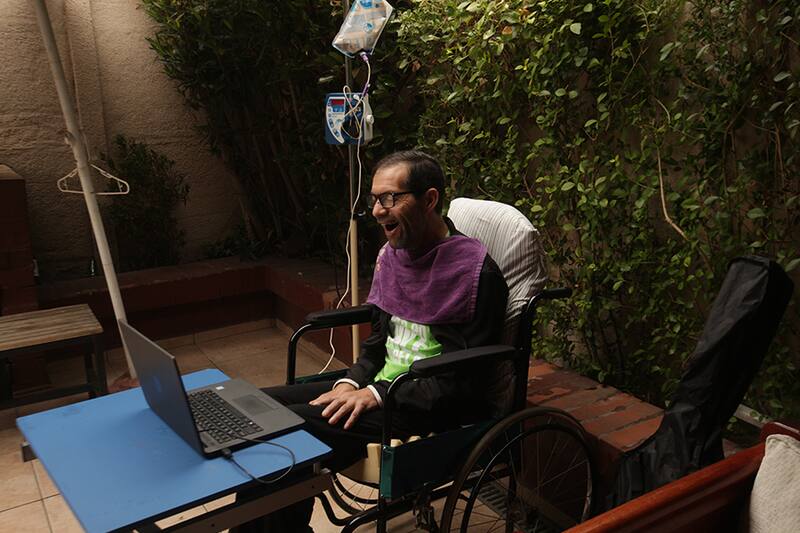 Roberto Díaz (55), de Puente Alto, hoy está sentado en una silla, comunicándose a través de un computador, moviendo sólo su cabeza, ojos y esboza una que otra sonrisa cuando mira a su esposa.