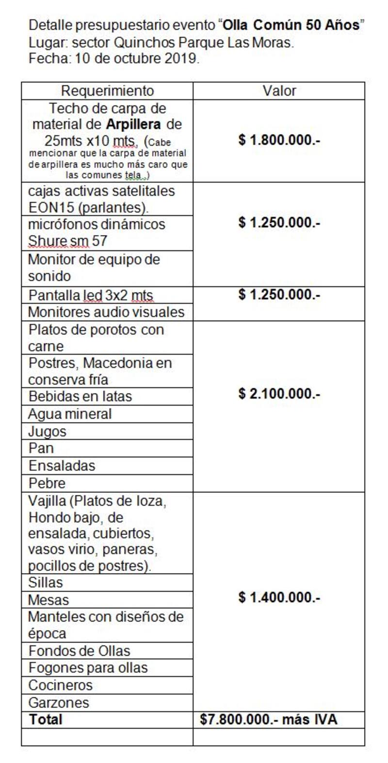 "Dicha jornada estaba destinada a rememorar la esforzada labor de vecinos que en difíciles tiempos mantuvieron ollas comunes, que permitían asegurar la alimentación de los pobladores de distintas poblaciones y sus familias y contó con una puesta en escena, cuyo costo total fue de 7 millones 800 mil pesos más IVA", agregaron.