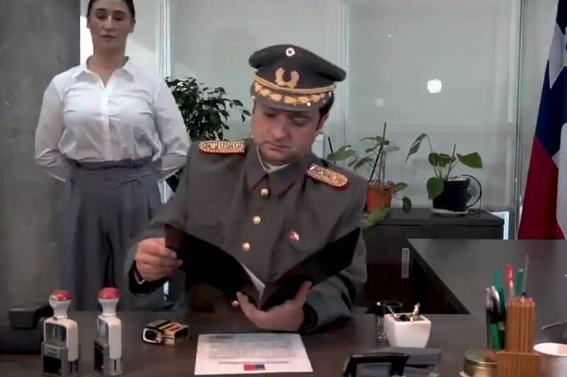 En el registro, se ve al "general" -interpretado por "Toto" Acuña- llamando a su secretaria Lucía: "¿Cómo que no? Comuníqueme. Si sé que es fin de semana, que venga igual. Lucía, venga inmediatamente, quiero leer la carta una vez más".