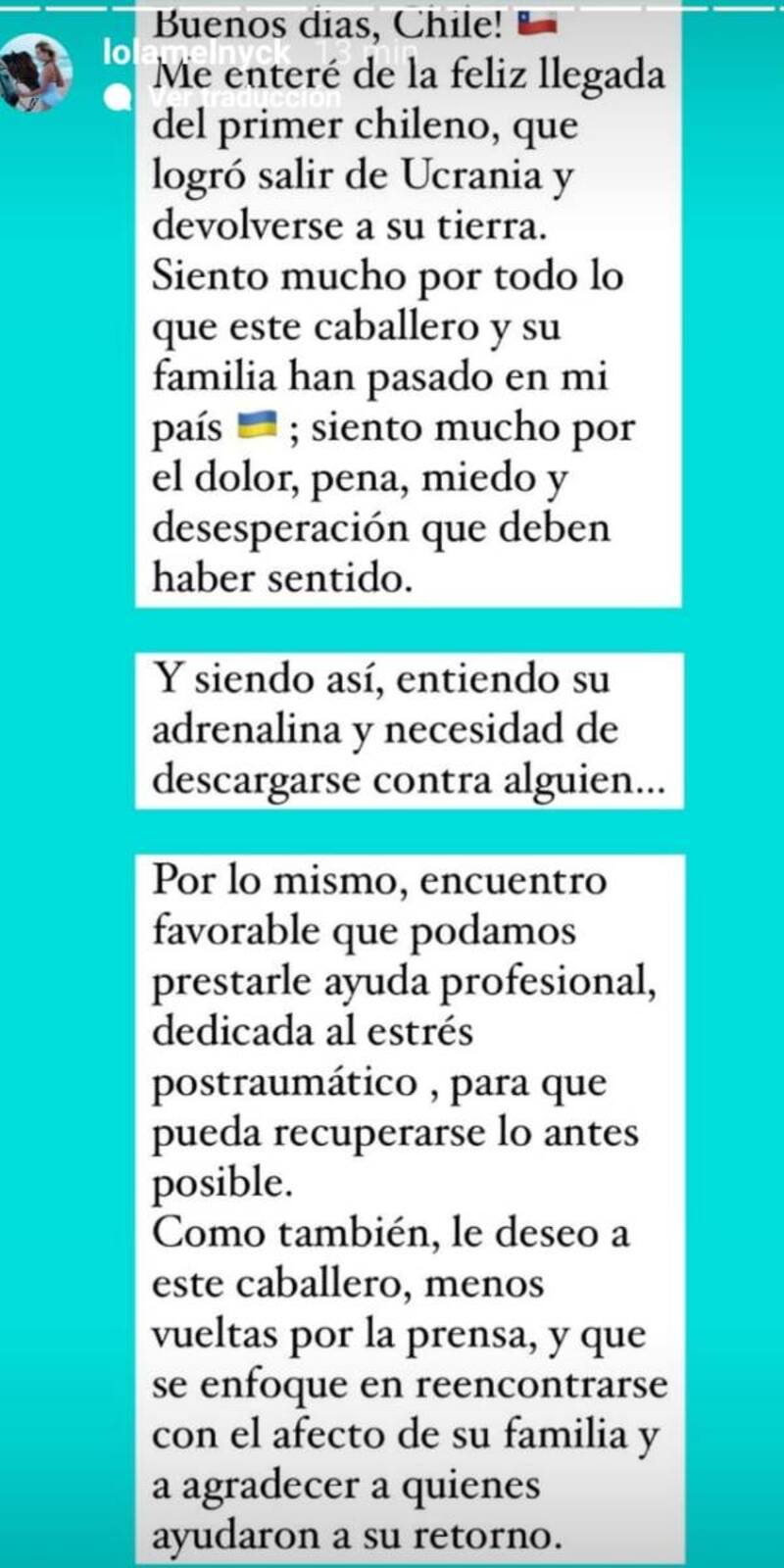 “Buenos días, Chile. Me enteré de la feliz llegada del primer chileno que logró salir de Ucrania y devolverse a su tierra”, indicó Lola.