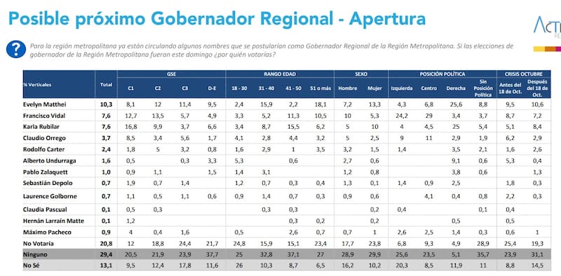 Los que se mantuvieron estables en el sondeo fueron Daniel Jadue, con un 5% de respaldo, y los senadores Felipe Kast y Manuel José Ossandón con un 3% de las preferencias.