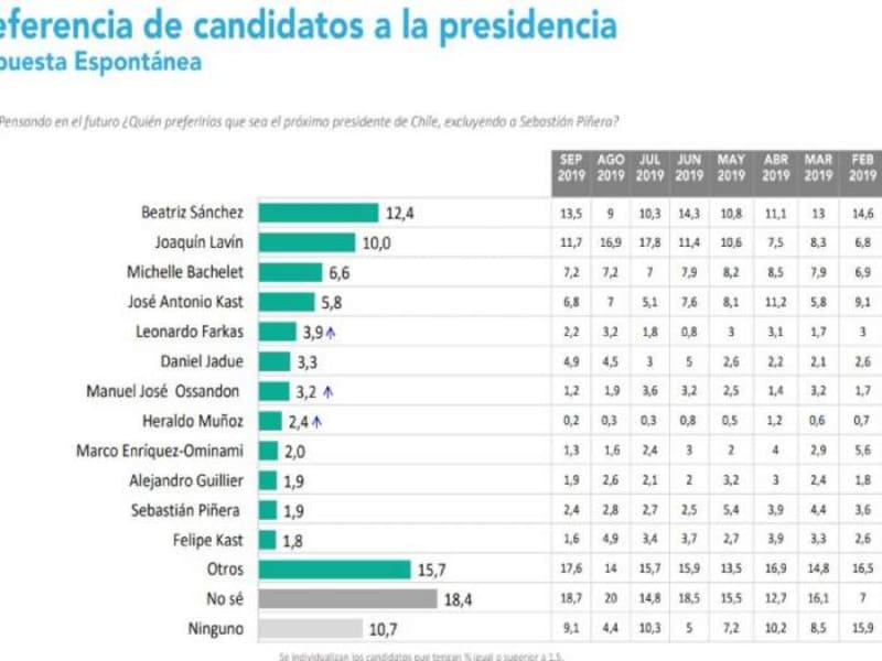 La citada encuesta está liderada Joaquín Lavín y Beatríz Sánchez, con un 14% y 10% respectivamente. Sin embargo, estos retrocedieron respecto al mes anterior. El alcalde de Las Condes bajó 3 puntos y la periodista 4.