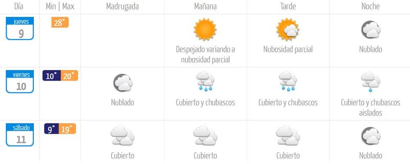 Finalmente, anunció que el sábado “se mantiene la probabilidad de precipitaciones en la cordillera del tramo con un ambiente nuboso y frío”.