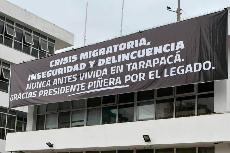 “Crisis migratoria, inseguridad y delincuencia nunca antes vivida en Tarapacá. Gracias Presidente Piñera por el legado”, reza el cartel de color negro que llamó la atención de los vecinos de Iquique.
