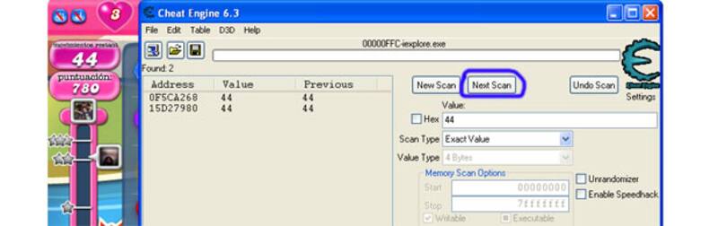 6- Posterior a eso, regresa al juego y haz un movimiento. A continuación, restale un movimiento al número escrito en el casillero "Value" y haz click en "Next Scan".