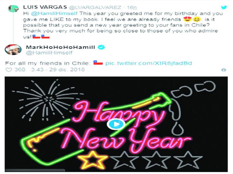 "Hola @HamillHimself este año me saludaste por mi cumpleaños y me diste como a mi libro. Siento que ya somos amigos. ¿Es posible que envíes un saludo de año nuevo a tus fans en Chile? Muchas gracias por estar tan cerca de aquellos de ustedes que nos admiran!", escribió el joven en su cuenta de twitter el pasado 28 de diciembre.