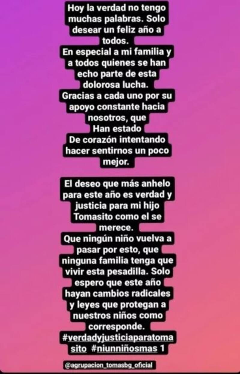 “Hoy la verdad no tengo muchas palabras. Solo desear un feliz año a todos. En especial a mi familia y a todos quienes se han hecho parte de esta dolorosa lucha”, expresó mediante las stories de su cuenta de Instagram.