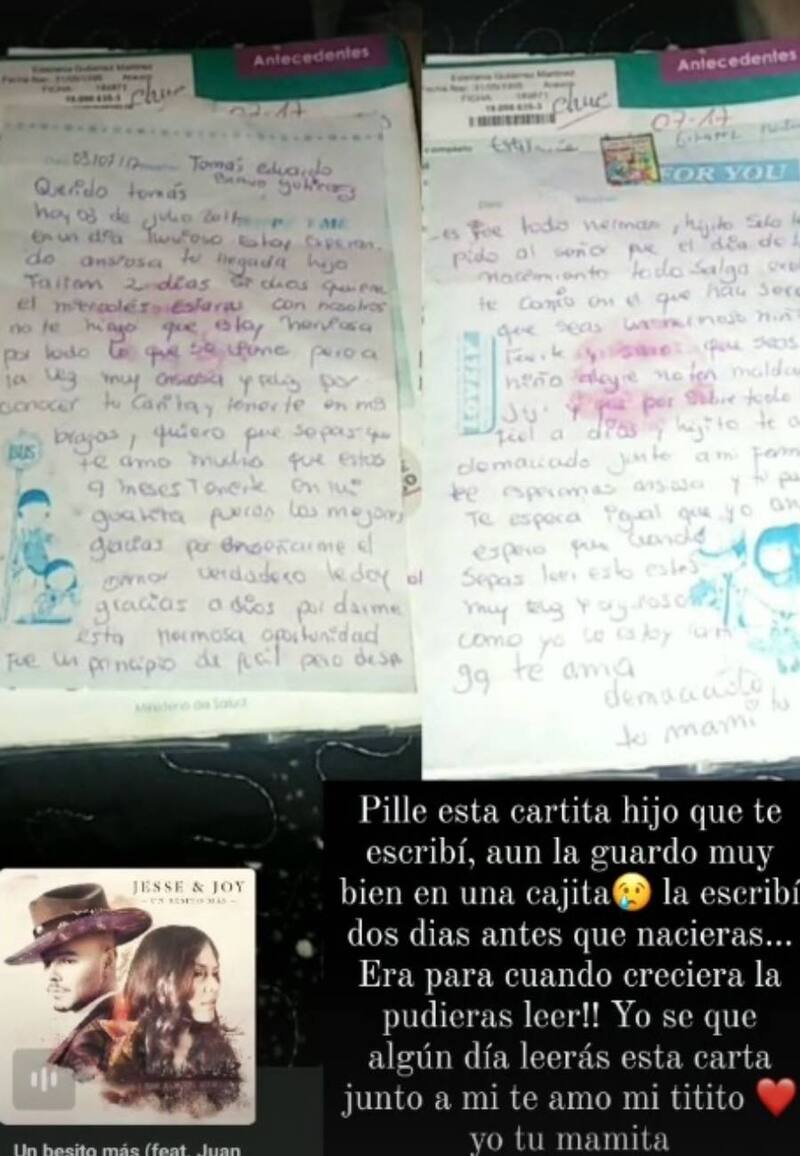 "Querido Tomás, hoy 3 de julio 2017, en un día lluvioso, estoy esperando ansiosa tu llegada, hijo. Faltan dos días. Si dios quiere, el miércoles estarás con nosotros. No te niego que estoy nerviosa por todo lo que se viene, pero a la vez muy ansiosa y feliz por conocer tu carita y tenerte en mis brazos, quiero que sepas que te amo mucho, que estos 9 meses tenerte en mi guatita fieron los mejores", reza la carta escrita por Estefanía.