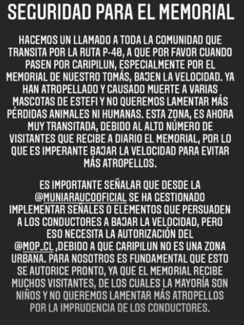 "Hacemos un llamado a toda la comunidad que transita por la Ruta P-40, a que por favor cuando pasen por Caripilun, especialmente por el memorial de nuestro Tomás, bajen la velocidad. Ya han atropellado y causado muerte a varias mascotas de Estefi y no queremos lamentar más perdidas animales ni humanas", rogaron en la publicación.