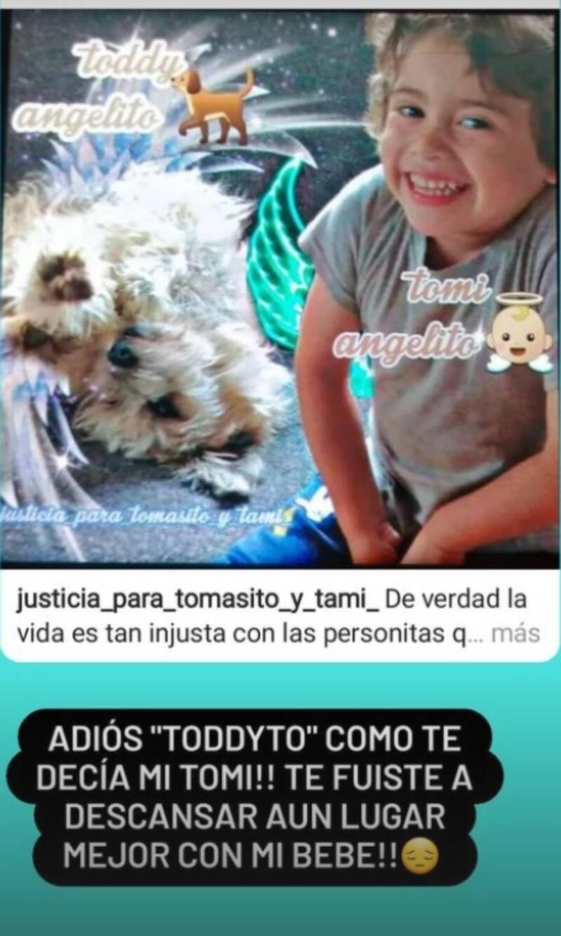 A través de redes sociales, la joven dedicó un emotivo mensaje para confirmar la triste noticia. "Adiós Toddyto como te decía mi Tomi!! Te fuiste a descansar a un lugar mejor con mi bebé", escribió.