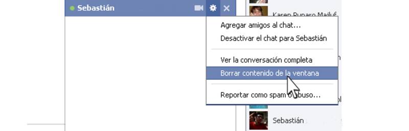 5.- Otro lugar que lo puede sapear es el chat directo, ese que está a la derecha de su Facebook. La ventana de conversación tiene la opción "Borrar la ventana", utilizando el icono y después seleccionando Borrar contenido.
