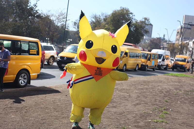 "Tía Pikachu" llegó con mascarilla a bocinazo de furgones escolares