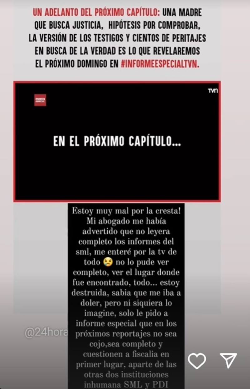 Asimismo, dio a conocer que “no lo pude ver completo (el capítulo), ver el lugar donde fue encontrado, todo… estoy destruida, sabía que iba a doler, pero ni siquiera lo imaginé”.