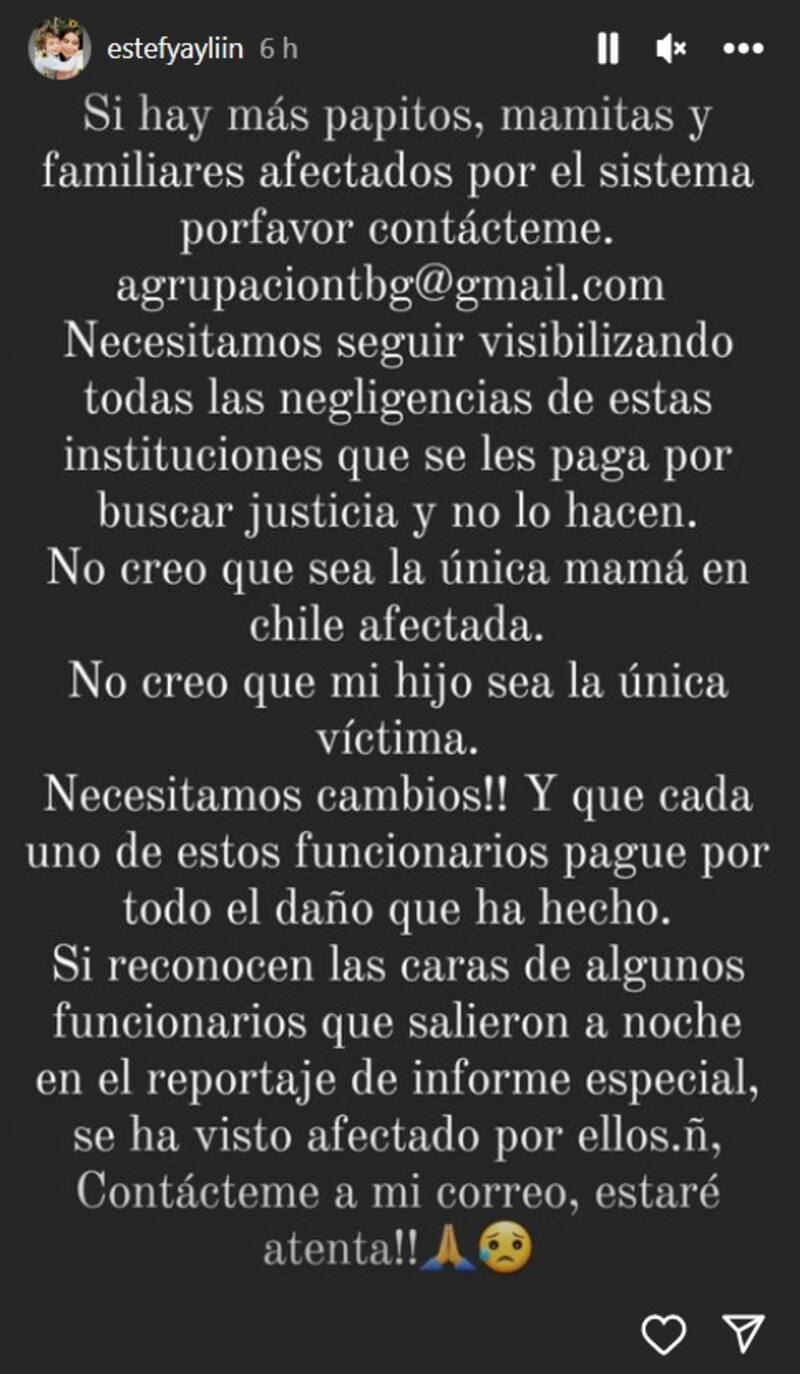 Finalmente, Estefanía hizo una particular petición: “Que los próximos reportajes no sean cojos, sean completos y cuestionen a Fiscalía en primer lugar, aparte de las otras dos instituciones inhumanas: SML y PDI”.