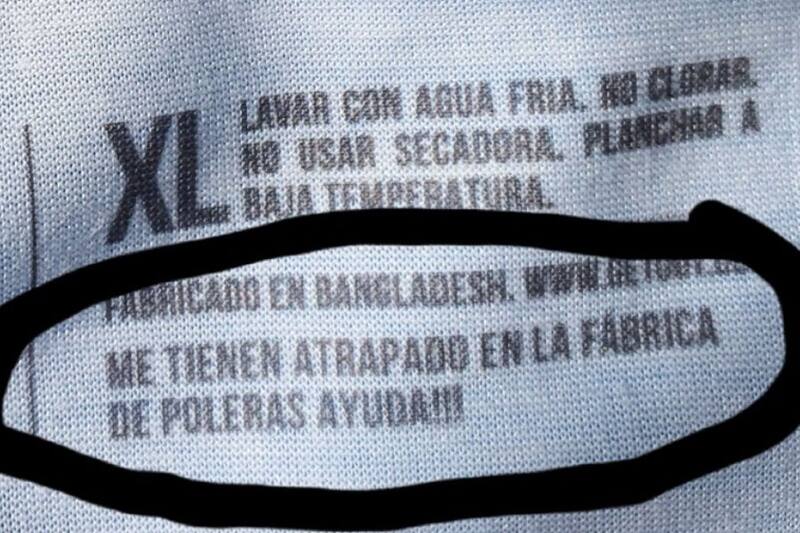 "Hoy recibí una compra hecha en Tiendas Paris, entre ellas una polera marca Get Out, y me encontré con este mensaje: 'Me tienen atrapado en la fabrica de poleras ayuda'. La situación es gravísima", explicó. En el tweet también adjuntó las imágenes que daban cuenta del hecho.