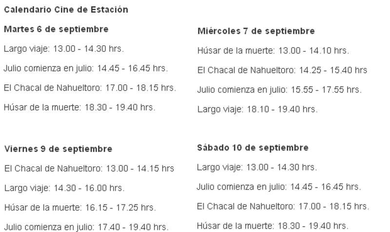 Las películas que podrá disfrutar son "El Húsar de la muerte" (Pedro Siena/1925), "Largo viaje" (Patricio Kaulen/1967), "El Chacal de Nahueltoro" (Miguel Littin/1969) y "Julio comienza en Julio" (Silvio Caiozzi/1979), todas al gratín.