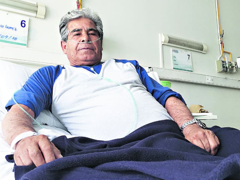 En la sala 301 de Cirugía y Pulmón, en el tercer piso del Hospital del Tórax, pasa los días el minero de 70 años Mario Gómez Heredia, solo acompañado de los seis pacientes que completan la habitación. Hoy cumple una semana desde que llegó desde Copiapó, para recibir en el recinto asistencial una nueva evaluación sobre la fibrosis pulmonar y la silicosis que lo mantiene conectado a un tubo de oxígeno y que cada día lo deteriora más. Claro que la maldita enfermedad, propia de la actividad minera, no amilana sus ganas de vivir.
