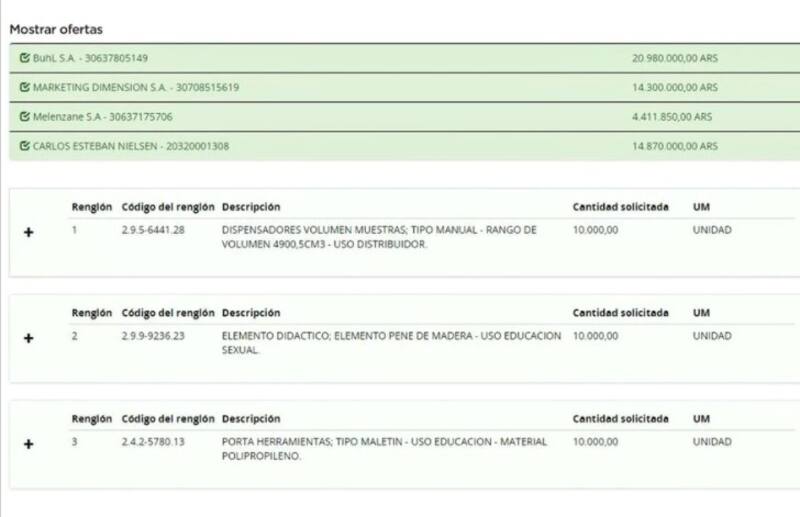"La adquisición de materiales de promoción, compuestos por dispensers de preservativos, penes de madera y maletines, solicitada por la Dirección de respuesta al VIH, ITS, Hepatitis virales y Tuberculosis, destinados a la población general y a profesionales de la salud, a distribuirse en los Centros de Atención Primaria de la Salud (CAPS), Regiones Sanitarias, Programas Provinciales, Municipales y otros establecimientos de todo el país", señalaron, provocando diversas reacciones.