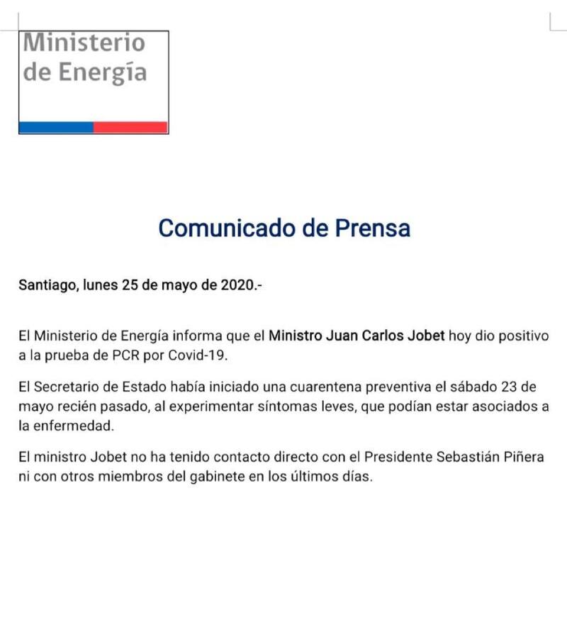 El ministro de Energía, Juan Carlos Jobet, dio positivo por covid-19. De esta forma es el segundo caso junto a Alfredo Moreno.