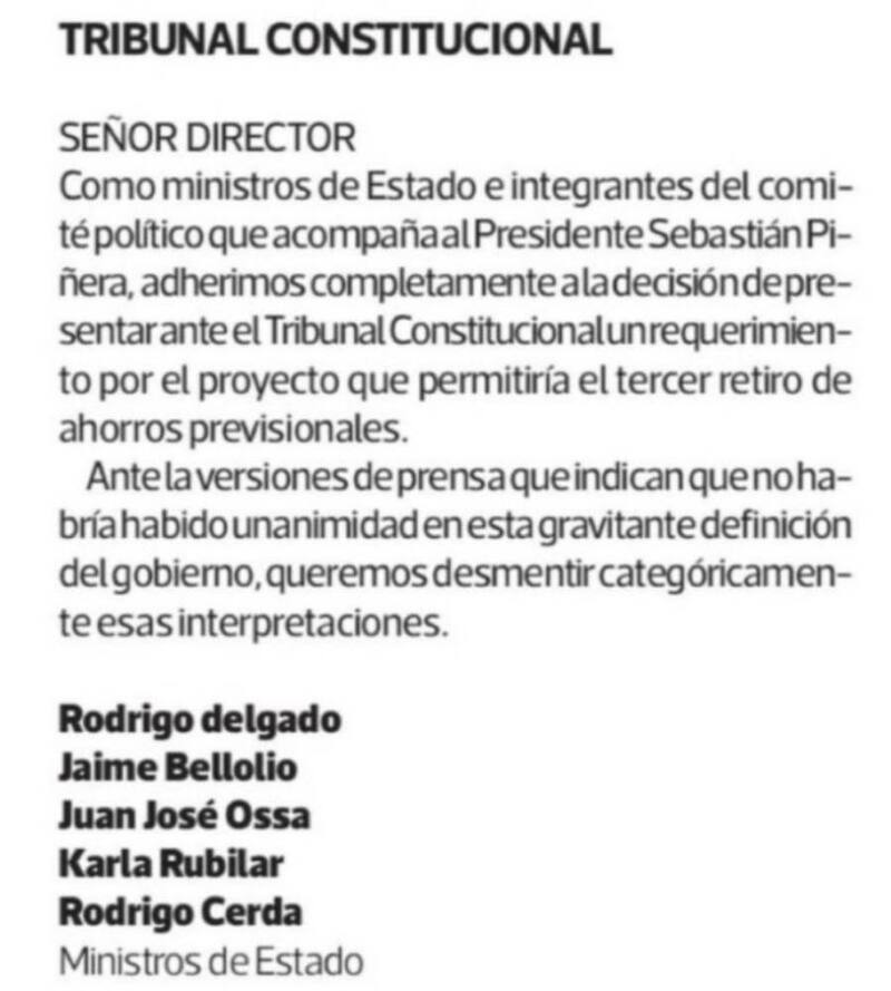 En la misiva, publicada por La Tercera, los secretarios de Estado precisaron que "como ministros de Estado e integrantes del comité político que acompaña al Presidente Sebastián Piñera, adherimos completamente a la decisión de presentar ante el Tribunal Constitucional un requerimiento por el proyecto que permitiría el tercer retiro de ahorros previsionales".