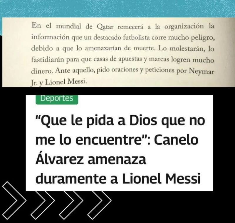 “En el mundial de Qatar remecerá a la organización la información que un destacado futbolista corre mucho peligro, debido a que lo amenazarían de muerte. Lo molestarán, lo fastidiarán para que casas de apuestas y marcas logren mucho dinero. Ante aquello, pido oraciones y peticiones por Neymar Jr. y Lionel Messi”, escribió en el libro.