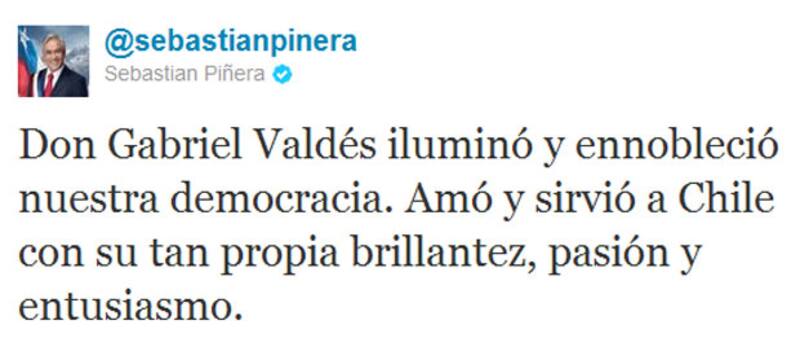 El propio Presidente de la República, Sebastián Piñera, también se refirió a la muerte de Gabriel Valdés por medio de su cuenta de Twitter. "Don Gabriel Valdés iluminó y ennobleció nuestra democracia. Amó y sirvió a Chile con su tan propia brillantez, pasión y entusiasmo".