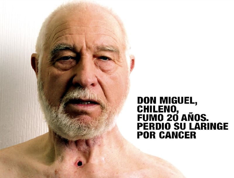 Miguel García fue el rostro de la primera advertencia gráfica presente en las cajetillas de cigarrillos en Chile. El aviso gráfico presentado durante el año 2006 advertía de los peligros al exponer que lamentablemente tuvieron que extirparle su laringe.