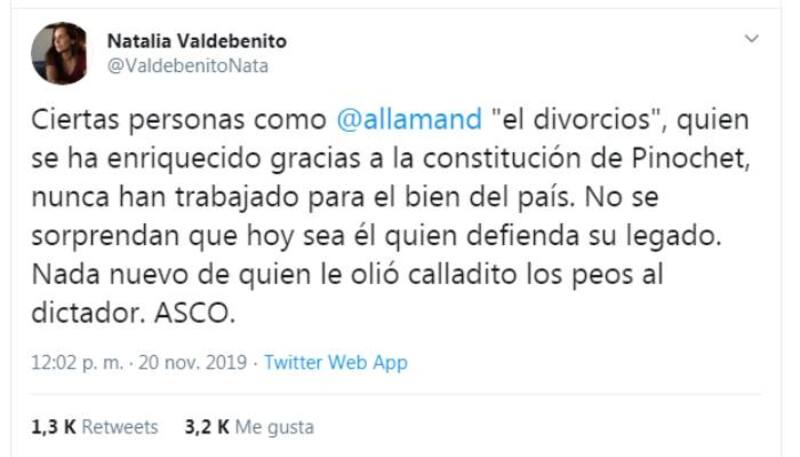 De hecho, fueron estas últimas palabras las que indignaron a Valdebenito. "Ciertas personas como Allamand, 'el divorcios', quien se ha enriquecido gracias a la constitución de Pinochet, nunca han trabajado para el bien del país. No se sorprendan que hoy sea él quien defienda su legado. Nada nuevo de quien le olió calladito los peos al dictador. ASCO", remató.