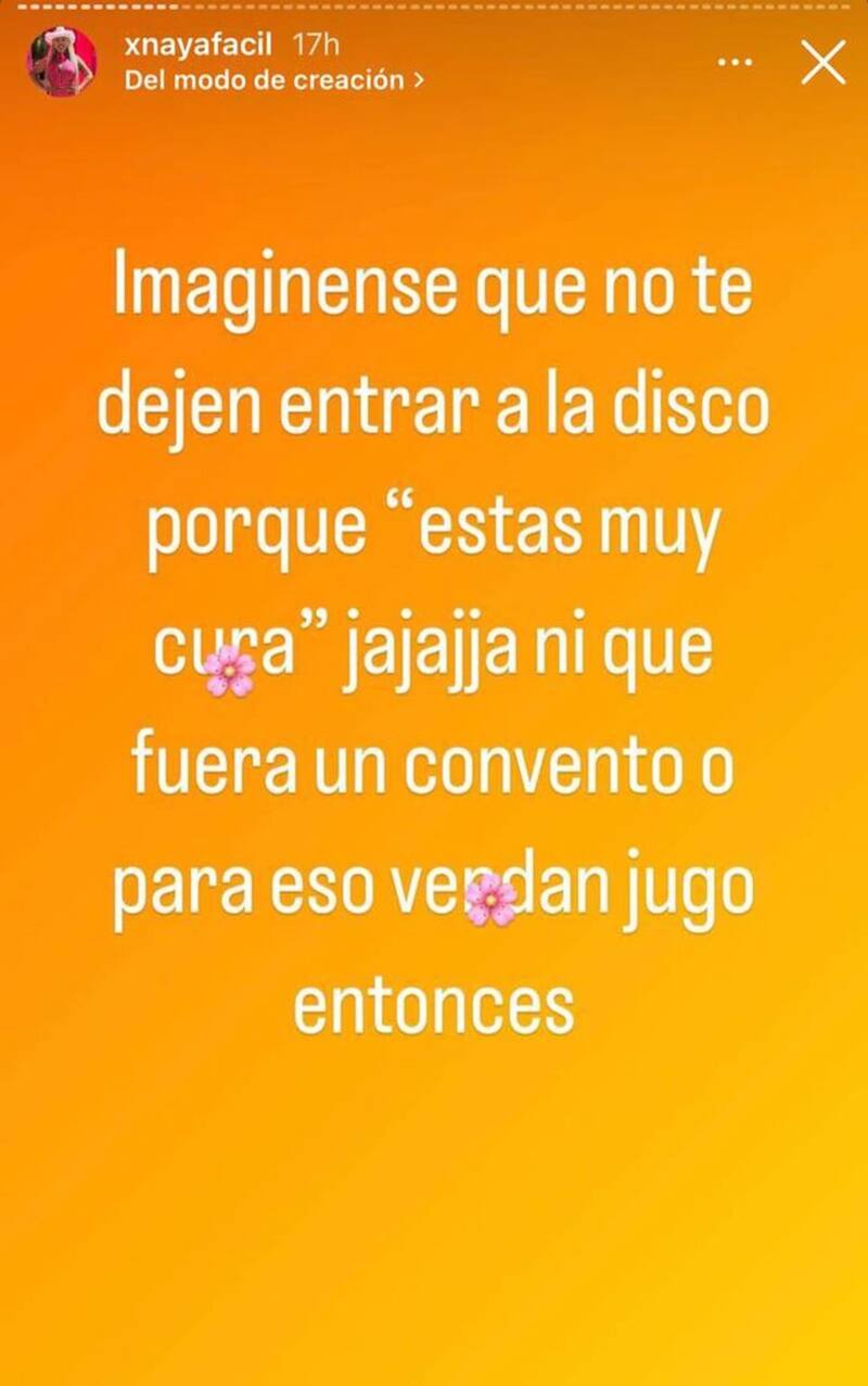Tras este hecho, Naya Fácil publicó un post aclarando la situación. “Imagínense que no te dejen entrar a la disco porque ‘estás muy curada’. Ja, ja, ja, ni que fuera un convento o para eso vendan jugo entonces”, sentenció.