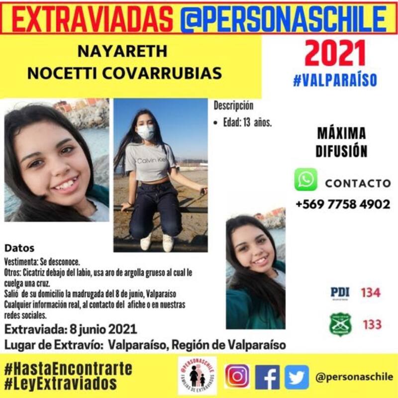 Durante la madrugada del pasado martes 8 de junio, la adolescente de 13 años Nayareth Nocetti Covarrubias salió de su casa ubicada en el cerro San Roque en Valparaíso, perdiendo su rumbo sin regresar a casa.