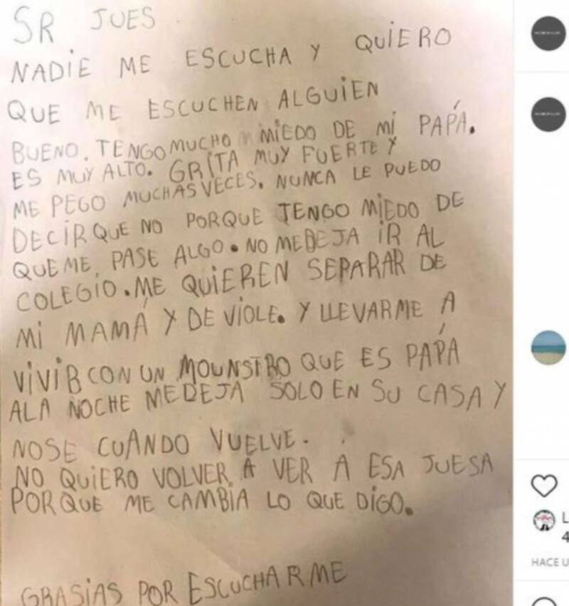 "Señor Juez: nadie me escucha y quiero que me escuchen, alguien bueno. Tengo mucho miedo de mi papá. Es muy alto. Grita muy fuerte y me pegó muchas veces. Nunca le puedo decir que no porque tengo miedo de que me pase algo", comenzó diciendo la misiva.