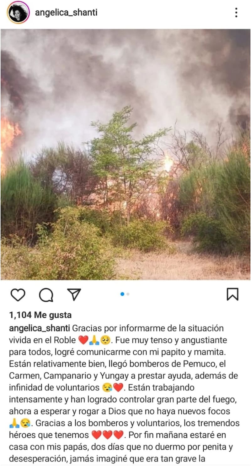 “Acabo de leer que el incendio llegó al ‘Roble’, lamentablemente no logro comunicarme con mi papá”, comunicó ella a través de su cuenta de Instagram. “Quién tenga mayor información escribir a través de mensaje privado, por favor”.