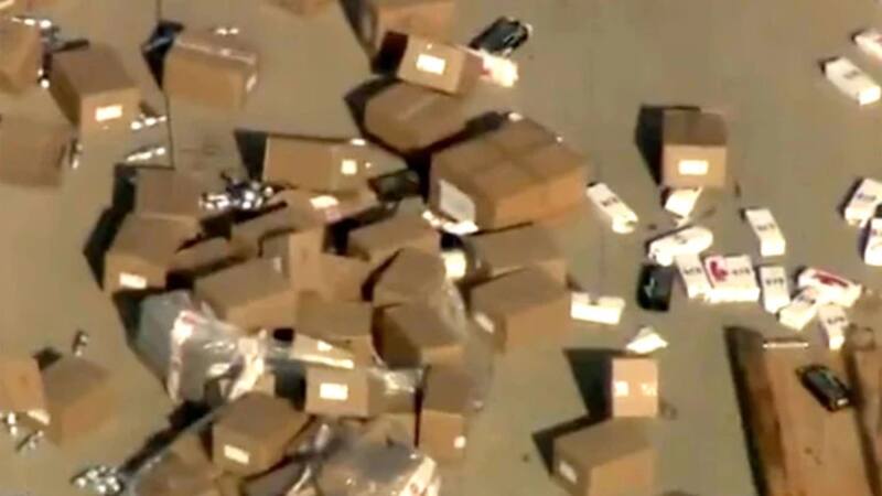 Las imágenes aéreas del gran número de cajas de juguetes sexuales y lubricantes esparcidos por la carretera fueron rápidamente viralizadas en Internet.