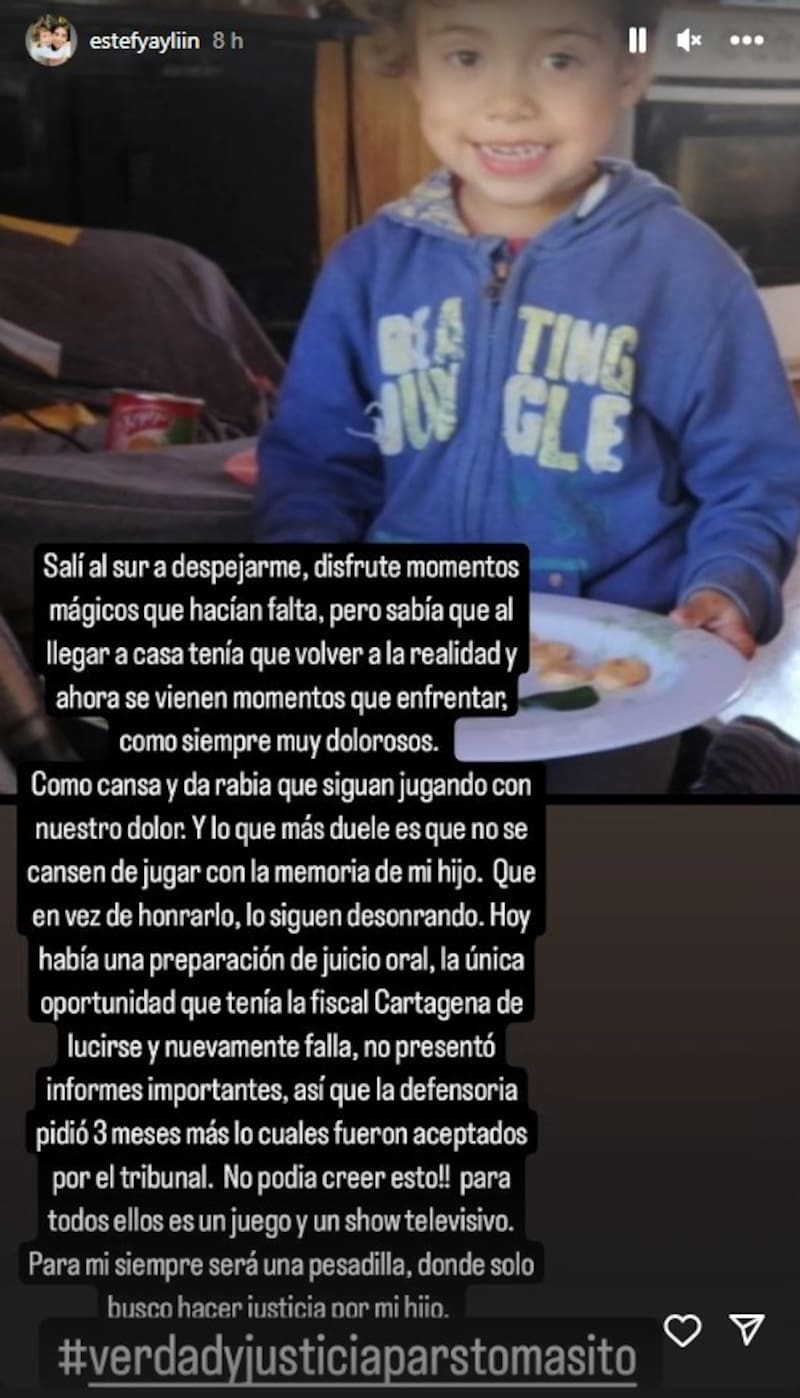 “Cómo cansa y da rabia que sigan jugando con nuestro dolor. Y lo que más duele, es que no se cansan de jugar con la memoria de mi hijo. Que en vez de honrarlo, lo siguen deshonrando”, partió acusando Estefanía en sus redes sociales.