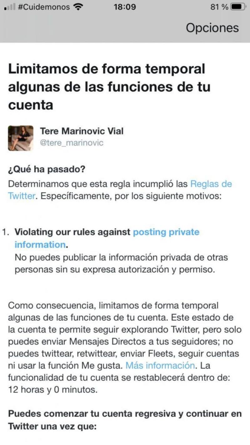“Limitamos de forma temporal algunas de las funciones de tu cuenta. ¿Qué ha pasado? Determinamos que esta regla incumplió las Reglas de Twitter. Específicamente por los siguientes motivos: No puedes publicar la información privada de otras personas sin su expresa autorización y permiso”, detalla la imagen.