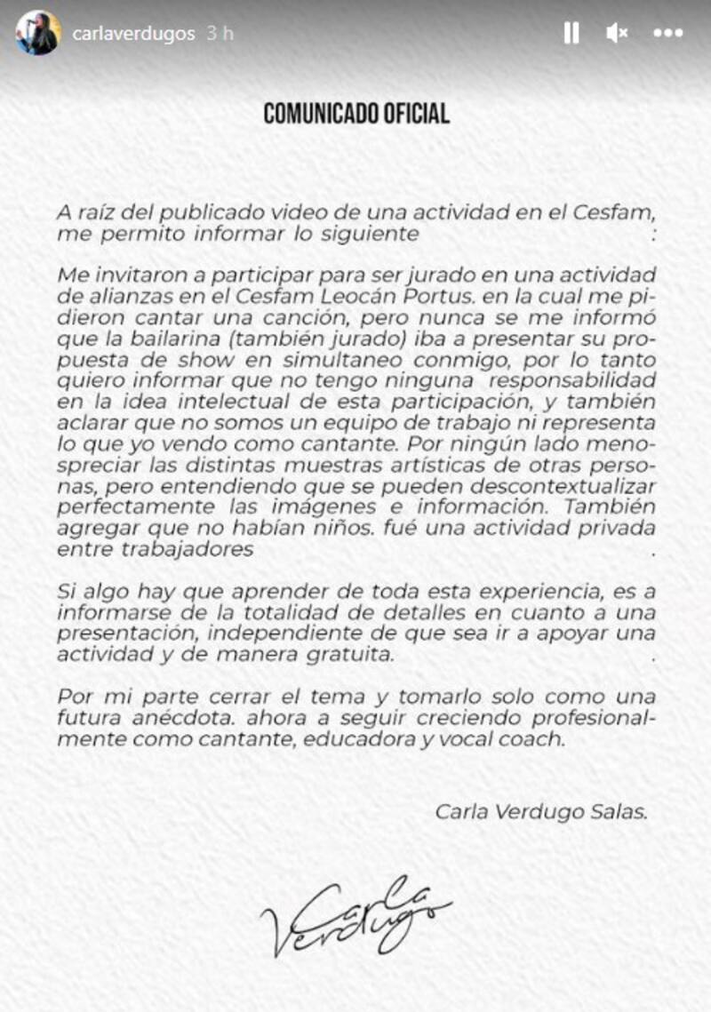 Carla Verdugo explicó que la invitaron a participar como jurado en una actividad de los funcionarios y le pidieron cantar una canción. “Pero nunca se me informó que la bailarina (también jurado) iba a presentar su propuesta de show en simultáneo conmigo”, recalcó.