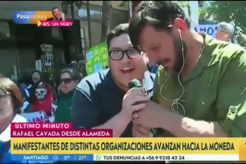 Todo comenzó cuando el reportero empezó a preguntar la opinión de los presentes. Así fue como varios dieron su parecer a cerca de los que ocurre el país y las injusticias que sufren día a día. Pero en un inesperado descuido, un joven agarró el micrófono de Cavada y lanzó su denuncia contra el rostro juvenil. "Karol Dance degenerado culiao", se alcanzó a escuchar al aire.