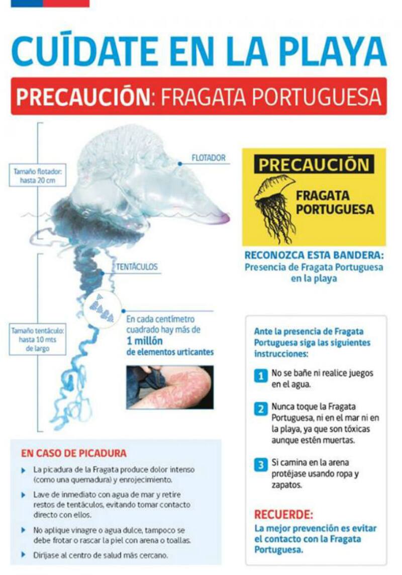Con la pera por el suelo están por estos días los veraneantes de las playas de la región Maule. ¿El motivox?x El Seremi de Salud levantó bandera amarilla en las playas de la provincia de Curicó por la presencia de la "Fragata Portuguesa", una especie que atrapa y paraliza a su presa y en el caso de los seres humanos el veneno tiene consecuencias neurotóxicas y provoca un gran dolor.