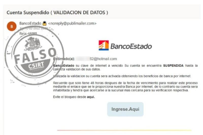 Esta nueva técnica tiene el nombre de phishing, la cual a través de correos electrónicos fraudulentos logra que la víctima entregue sus datos personales y así poder acceder a sus cuentas. Lo mismo reportaron los clientes del Banco, quienes recibieron un correo aparentemente de la entidad bancaria, con el mensaje de que la cuenta sería suspendida y para regular la situación debían ingresar a un link externo.